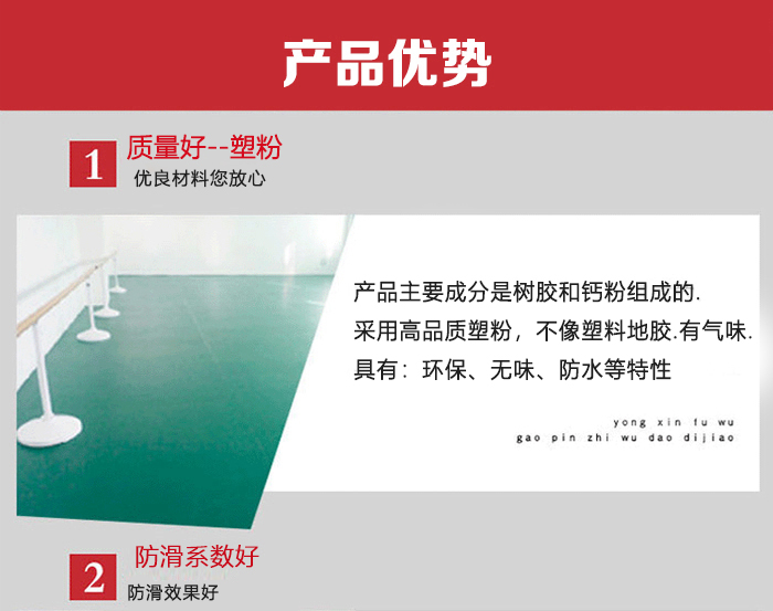 蝶舞系列能緩·解劃痕,開創(chuàng)了舞蹈地膠不僅實(shí)用,而且美觀的先河,運(yùn)用新型科技,技術(shù)嫻熟,科學(xué)的配方,為舞者專業(yè)打造;潤而不澀,表面無紋理,質(zhì)地細(xì)膩,軟硬適中、感舒適、易于安裝,顏色靚麗自然,沒有氣味兒。防噪、阻燃、易打理,穩(wěn)定性強(qiáng),表里如一,使用壽命長等優(yōu)點(diǎn)。適用于對美觀度要求較高的客戶